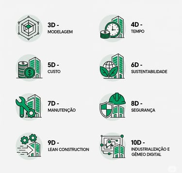 8D – Saúde e Segurança A segurança é planejada digitalmente. O 8D integra diretrizes e normas de segurança do trabalho ao modelo BIM. Ele permite o mapeamento de riscos e o planejamento de um canteiro seguro em cada fase da obra , ajudando a reduzir acidentes e passivos trabalhistas, além de garantir a conformidade legal do projeto.